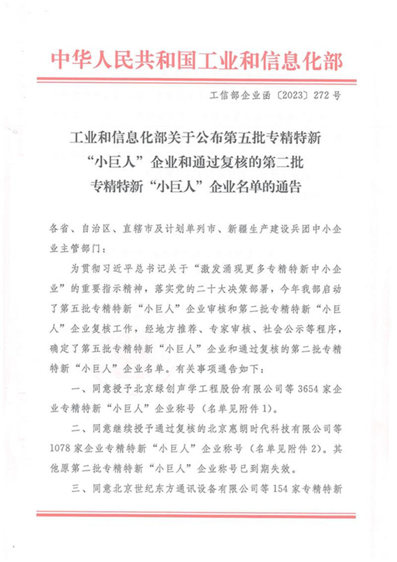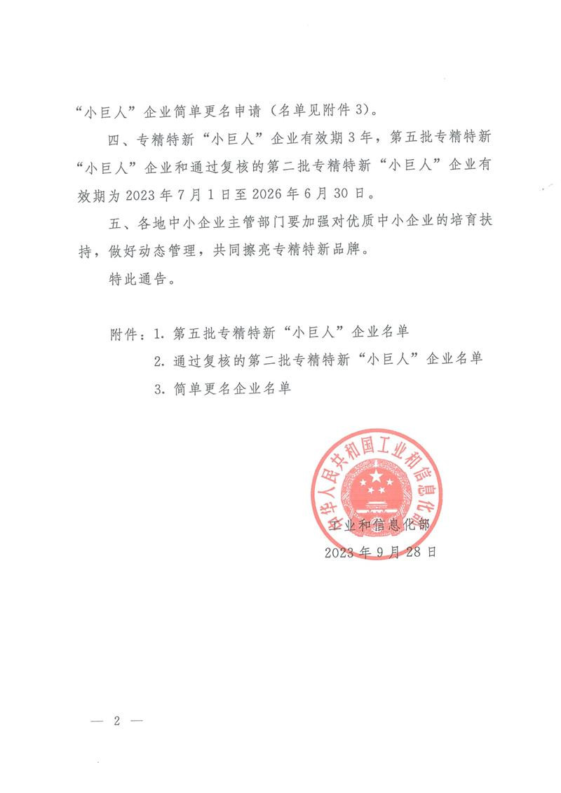 為貫徹習(xí)近平總書(shū)記關(guān)于“激發(fā)涌現(xiàn)更多專精特新中小企業(yè)”的重要指示精神,落實(shí)黨的二十大決策部署,工業(yè)和信息化部啟動(dòng)了第五批專精特新“小巨人”企業(yè)審核的工作,我公司榮獲第五批專精特新“小巨人”稱號(hào)。